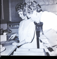 KEL 885 001 A woman cuts a pan of brownies while another woman retrieves silverware from a kitchen drawer at a party for students of the Idaho State Deaf and Blind School held at the home of Mrs. E. W. McRoberts by the Delta Gamma Alumnae Association. A plate, a bowl of punch, and kitchen utensils sit on the counter top. A spice wrack is located below the kitchen cupboards. At the back of the kitchen is a sink with a curtained window above it.