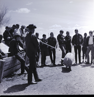 KEL 880 Bob Loucks, Camas County agent, explains how he judges hogs at the East Magic Valley FFA District Livestock Contest held at the Jim Brooks Ranch in Hazelton. A group of FFA members surround the scene. Several members sit on a sloped pen roof, watching the hog.