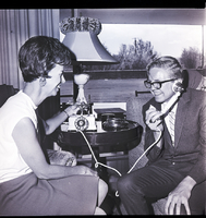 KEL 885 002 Mrs. Alfred Blandford shows Gary McKinley an unusual telephone at a party for students of the Idaho State Deaf and Blind School held at the home of Mrs. E. W. McRoberts by the Delta Gamma Alumnae Association. Mr. McKinley sits in a recliner and holds the receiver of the telephone while Mrs. Blandford sits on a couch and adjusts a setting on the cradle. The telephone sits on a small round end table between the couch and recliner. Also on the end table is an ash tray and a lamp. Behind them is a large curtained window, and the backyard is seen through the window.