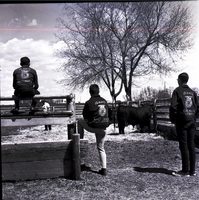 KEL 881 Three boys wearing FFA jackets watch a bull in a pen at the East Magic Valley FFA District Livestock Contest held at the Jim Brooks Ranch in Hazelton. Two of the boys wear jackets reading "Idaho East Magic Valley District" across the back, and the other boy wears a jacket reading "Idaho West Minaco" across the back. Herschel Boydstan stands in the pen and explains the proper way beef cattle should be judged. Several trees are in the distance.