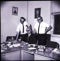 KEL 589 From left to right, Twin Falls County Commissioners Morris W. Carlson, Heber J. Loughmiller, and Maurice V. Klaas look over an accident survey put out by the extension service. On the desk in front of them is an open binder, two telephones, and a name plate reading "Morris W. Carlson." A framed picture of President John F. Kennedy hangs on the back wall. A tree is visible through a window in the wall behind the desk.