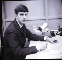 KEL 585 Rip Wilson, Twin Falls High School senior and elected governor for the Idaho YMCA Youth Legislature, sits at a desk filling out a form. He is dressed in a suit and tie. On the desk beside him is a typewriter, a telephone, and several papers.