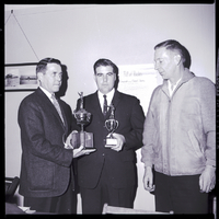 KEL 579 The high point aggregate scorer for the Twin Falls Police Department pistol competition, Cloyce Edwards, center, displays the trophies he won to O. J. Smith, left, and Police Chief Frank Barnett. Smith, city editor for the Times-News, presented the trophies on behalf of the Times-News, which sponsors the trophies each year. On the wall behind them is a poster of the Bill of Rights and a framed photograph.