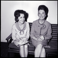 KEL 583 Red Cross officials make tentative plans for a six hour course for nurses in natural disaster training. Seated from left to right are Mrs. Mary Bolton, Red Cross nurse recruiting chairman, Zara Lund, Red Cross regional nursing representative, and Mrs A. L. Wirsching, Red Cross nursing chairman. They are wearing dresses, and Mrs. Wirsching is wearing a hat. Mrs. Lund is holding a booklet of papers on her lap, and Mrs. Wirsching is holding a pamphlet. They are seated on a bench, and a framed certificate hangs on the wall above them.