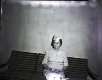 KEL 477 Mrs. Lynn Popplewell, president of the Cheerful Matrons, sits on a couch. She is wearing a dress.