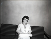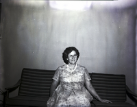 KEL 467 Mrs. William C. Armga, president of the Past Oracles Club, sits on a couch. She is wearing a floral print dress.