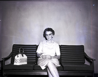 KEL 469 Mrs. Ronnie Pope, president of the Magic Valley Young Wives, sits on a couch. She is wearing a floral print dress. A purse sits beside her on the couch.