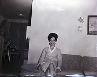 KEL 464 Mrs. Morris Vavold, president of the Nazarene World Missionary Society of the Twin Falls First Nazarene Church, sits on a couch. She is wearing a blouse, jacket, and skirt. A package sits on her lap.