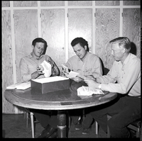 KEL 370 TFFD firemen Larry Crippen, John King, and Floyd Gambrel sit around a round table and stuff newsletters into envelopes to send to Twin Falls residents for Fire Prevention Week. The safety letters urge Twin Falls residents to remove all fire hazards and make their homes safe from fire.