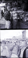 KEL 285 In the top image, two little boys sit inside the car of a carnival ride at the Twin Falls County Fair. Other carnival rides are seen in the background. In the bottom image, a group of boys stand outside a Midway booth. A man and a woman are inside the booth, giving directions. One boy is holding a gun, ready to shoot for prizes. Inside the booth is a wall of boxes of Crackerjacks, and stuffed animals hang from the ceiling.