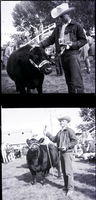 KEL 288 Glenn Shoemaker, member of Future Livestock Club, shows off his grand champion first place winner in the senior division beef fitting and showing at the Twin Falls County Fair. He is wearing a jacket and a cowboy hat, and holding his trophy. His winning cow stands beside him. Some people are sitting on the bleachers behind him. Other men in cowboy hats are holding their cows by bridles in the background.