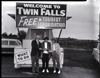 KEL 219 Examining one of several information pamphlets available to tourists at the tourist information booth on the south side of Perrine Memorial Bridge are, from left to right, Ray Rostron, secretary and manager of the Twin Falls Chamber of Commerce, Mrs. Harold Griff and Mrs. Bill Morrison, members of the Twin Falls Jay-C-Ettes. The sign above the booth reads "Welcome to Twin Falls, Free Tourist Information." A sign on the lower part of the booth reads "What To Do." Some automobiles (cars) are parked to the side and behind the information booth. In the background is a wooden fence, and trees and sage brush can be seen beyond it.