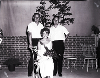 KEL 226 Cheryl Couch, winner of the Miss Twin Falls pageant, is seated and holding a bouquet of roses, while runners-up Pamela Jones and Deanna Peterson stand behind her with a man. The event was sponsored by the Twin Falls Lions Club and held at the Twin Falls High School gymnasium. The women are dressed in formal gowns and sashes, and Cheryl Couch wears a tiara. The man wears a tuxedo with a bow tie and has a corsage in his jacket. Some potted plants, a statue holding a flower arrangement, and a table and chair are in the background.