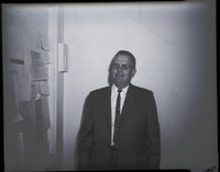 KEL 075 Lund Christensen, dressed in a suit and tie, stands in the corner of a room. On the wall beside him is a light switch and a bulletin board filled with papers.