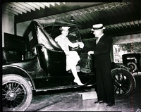 KEL 080 William L. Rude, president of the Gooding Regional Horseless Carriage Club, helps his wife out of a 1925 Model T Ford car at a Horseless Carriage Club tour and old-time fashion show. Mr. Rude is dressed in a suit and tie and a boater hat, and Mrs. Rude wears a dress and bonnet. A cement block is under the car, and another car can be seen in the background.