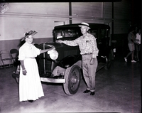 KEL 078 Mr. and Mrs. Ben H. Minger polish a 1931 DeVaux car at a Horseless Carriage Club tour and old time fashion show. Mr. Minger is dressed in a plaid shirt, slacks, and a boater hat. Mrs. Minger is dressed in a wide-brim bonnet, dress, and long gloves. Some folding chairs line the wall, and people are walking in the background.
