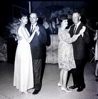 KEL 909 From left to right, Mr. and Mrs. Oliver Molyneux and Mr. and Mrs. Clarence Werner dance at a formal dinner-dance held by the Welcome Wagon Newcomers Club at the Blue Lakes Country Club. The Rubaiyats are playing musical instruments in the background in front of a rock fireplace.