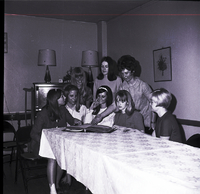 KEL 913 Attending Girls State at Northwest Nazarene College in Nampa, from Twin Falls, are seated from left to right, Susan Billington, Barbara Barker, Cynthia Ronk, Paula Hawks, and Kathy Lincoln. Standing behind them are three alternate attendees. The girls were selected by the Twin Falls High School faculty and the American Legion Auxiliary of Twin Falls. The group of girls sit around a table looking at a scrapbook. The table is covered in a white tablecloth. Against the back wall is a piano. On top of the piano is a small clock, a centerpiece of a basket of silk flowers, and some lamps. Beside the piano is an end table, a folding chair, and a pair of crutches propped up against the wall. A picture of a bouquet of flowers hangs on the side wall.