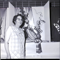 KEL 905 Mrs. Ed Conrad holds up a vase of light-colored irises at an iris show sponsored by the Magic Valley Iris Society and held at the Twin Falls YMYWCA. Mrs. Conrad was the second sweepstakes winner and received the AIS bronze medal certificate for second greatest number of cultural firsts. On the vase is the award ribbon from the Iris Society. On the table beside her is a vase of dark-colored irises.