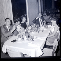 KEL 908 Members of the Welcome Wagon Newcomers Club enjoy drinks during a formal club dinner-dance held at the Blue Lakes Country Club. From left to right are Frank Overand, Mrs. Frank Overand, Mrs. Jim Curtright, Jim Curtright, and Mrs. Max Euteneier. The table is covered in a white tablecloth, and several cups, some candle holders, and a centerpiece of flowers is on the table. Some other diners are seen in the background.